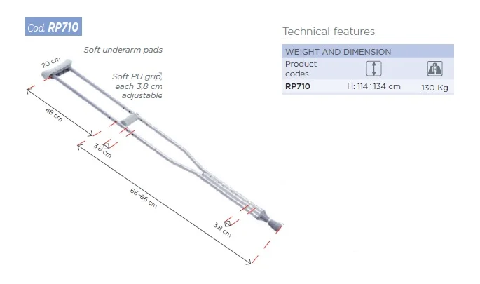 - Nastavljiva višina bergel: od 114 do 134 cm (višina do podpazduhe)