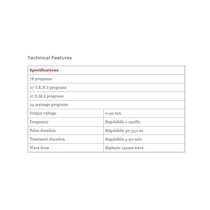Večinoma se uporablja za rehabilitacijo mišic, za zmanjšanje mišičnih krčev, zmanjšanje ali odpravljanje atrofije, izboljšanje gibljivosti in krvnega obtoka. Dvokanalna digitalna naprava, lahka in enostavna za uporabo, z 78 programi: 27 za T.E.N.S., 27 za E.M.S. in 24 za masažo.