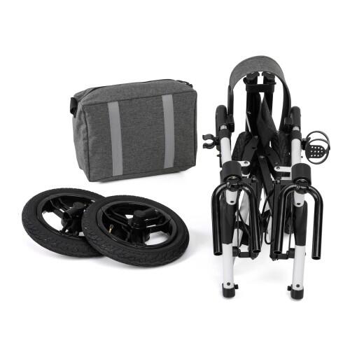 - Komplet vsebuje: ogrodje s sedežem, prednja kolesa, noge z zadnjimi kolesi, naslonjalo, nakupovalno torbo, tlačilko, držalo za skodelico, držalo za bergle/palice.